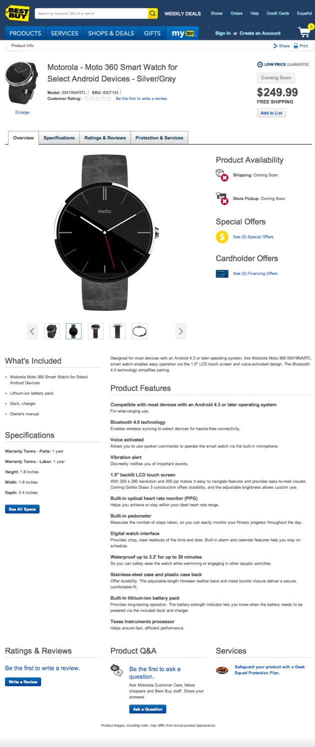 Bien qu’il ne s’agisse que d’une simple annonce non certifiée, ce détail a été répertorié dans la fiche technique de la Moto 360 de Best Buy, précisant : “Wireless compatibility: Wireless-N”. Encore une fois, en supposant que les informations sur la page soient réelles, elles suggèrent fortement que la Moto 360 soit livrée avec sa propre antenne Wi-fi.