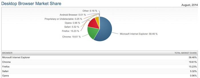 Parmi les navigateurs de bureau qui ont gagné des utilisateurs durant le mois d’août, Internet Explorer a connu le plus grand pic avec 0,45% de parts de marché supplémentaires. Firefox a connu la plus petite hausse des trois, avec 0,15% de parts de marché.