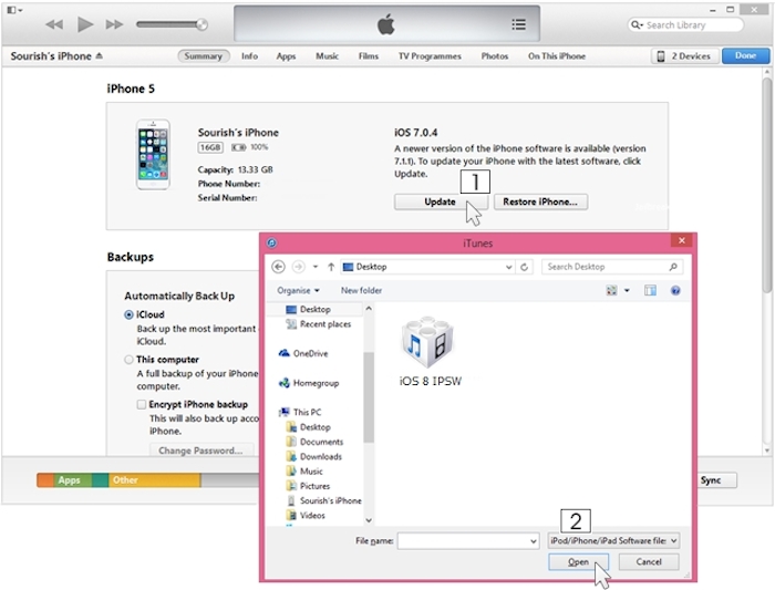 - Une fenêtre s’ouvre, sélectionnez le firmware iOS 8, cliquez sur “Ouvrir”