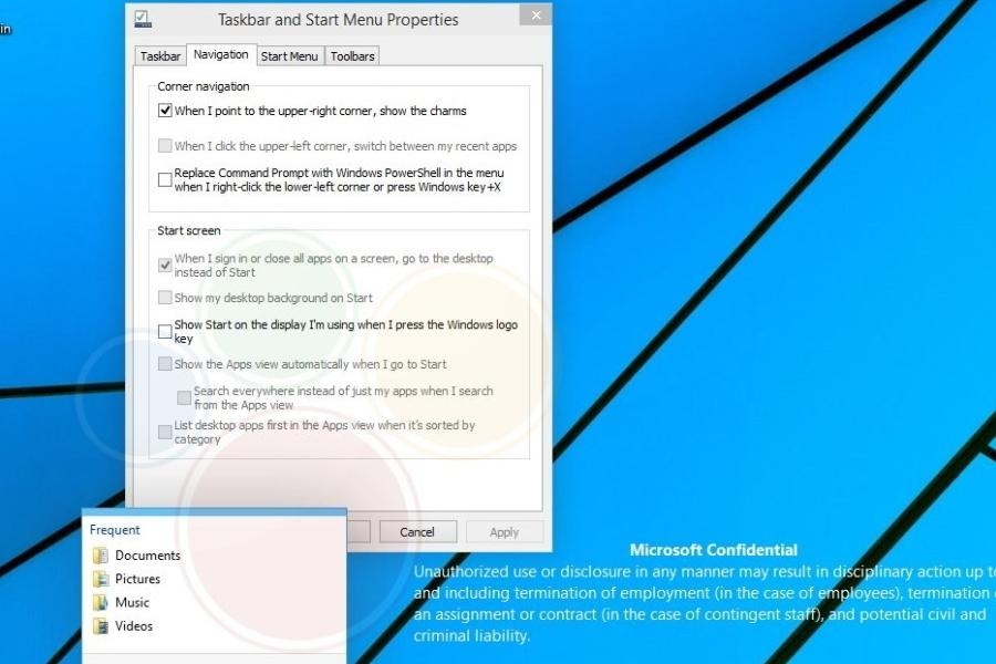 Dans une capture d’écran qui montre le menu “Taskbar and Start Menu Properties”, l’option pour désactiver la barre des Charmes existe toujours, comme c’est le cas dans Windows 8.1 en ce moment. Cela implique que la barre des Charmes est belle et bien vivante dans Windows 9.