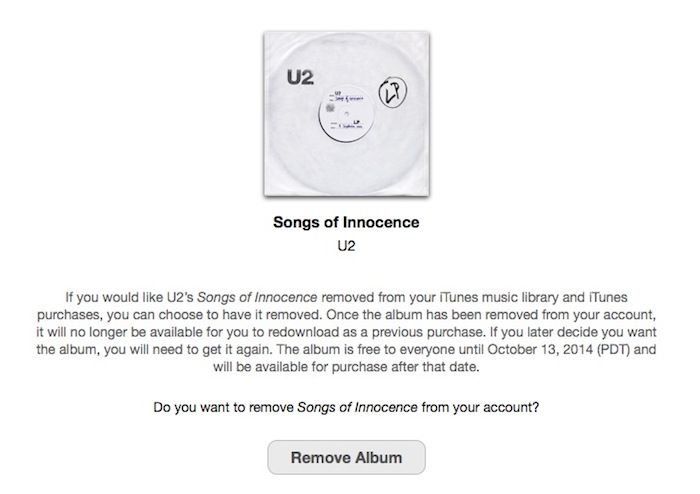 Autrement dit, si vous voulez que l’album de U2 Songs of Innocence soit supprimé de votre bibliothèque musicale iTunes et des achats sur iTunes, vous pouvez l’enlever très simplement. Une fois que l’album a été supprimé de votre compte, il ne sera plus disponible, et vous devrez le télécharger à nouveau comme un nouvel achat. Sachez que l’album est gratuit pour tous jusqu’au 13 octobre 2014, et sera disponible à l’achat après cette date, peut-on lire sur la page de suppression d’Apple.