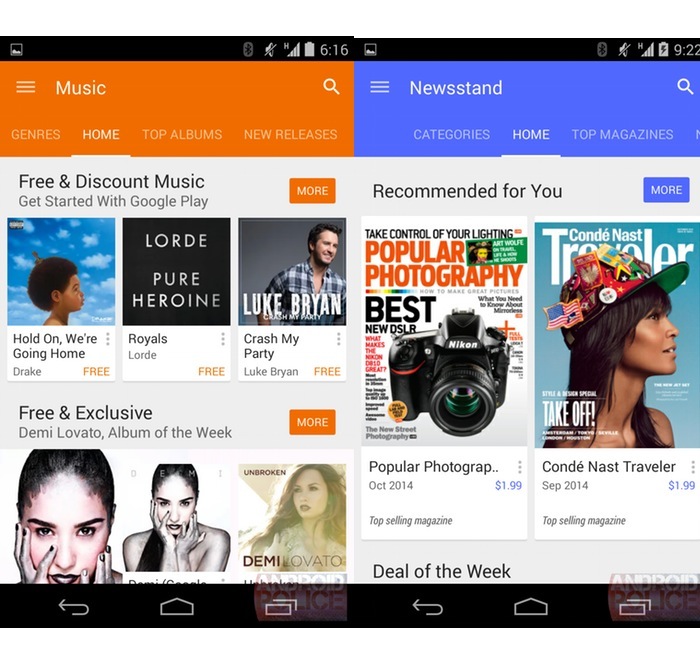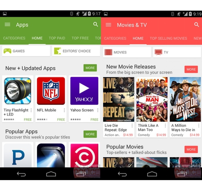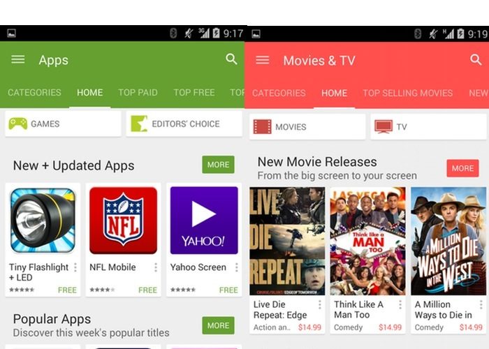 Comme vous pouvez le voir sur les images ci-dessus, Google a tout simplement adoptée la conception Material Design pour son Google Play Store, notamment avec une typographie audacieuse et un aspect plus propre. Autrement dit, certains éléments sont passés à une conception à plat. Vous pouvez également obtenir des couleurs plus vives. Un grand nombre de pages sur le Play Store offrent dorénavant des images en fond, au lieu d’avoir un fond blanc uni – ajoutant un attrait visuel.