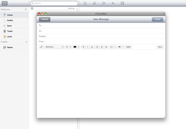 iCloud.com inclut une nouvelle version de l’application Mail qui semble très similaire à celle que l’on a dans OS X Lion et bien sûr, sur l’iPad. Lorsque vous cliquez sur les icônes depuis n’importe quelle application, l’affichage se met en plein écran, et vous disposez d’un petit logo “icloud” en haut à gauche, qui vous permet de revenir au menu principal.