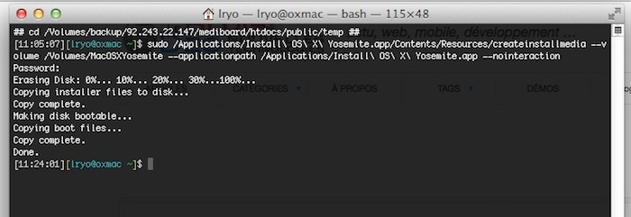 - Saisissez, ou copiez-collez, la commande suivante dans la fenêtre du Terminal et appuyez sur Entrée – remplacez le nom MacOSXYosemite par le nom donné à votre clé : sudo /Applications/Install\ OS\ X\ Yosemite.app/Contents/Resources/createinstallmedia –volume /Volumes/MacOSXYosemite –applicationpath /Applications/Install\ OS\ X\ Yosemite.app –nointeraction