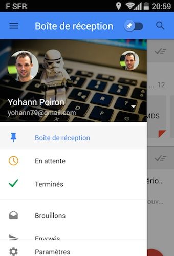 - Depuis l’écran principal de Inbox, ouvrez le tiroir de navigation sur la gauche, et tapez sur le nom de votre compte. Cela permettra d’élargir la liste de tous les autres comptes Google associés à votre terminal. Il vous reste à pointer le compte de votre ami, et le tour est joué !