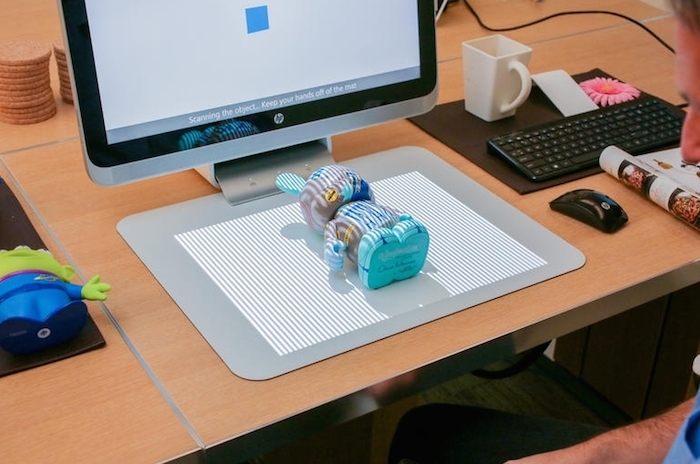 Le premier est un nouveau système de numérisation nommé Sprout. Il s’agit fondamentalement d’un ordinateur de bureau tout-en-un sous Windows avec un scanner 3D incrusté sur le dessus et dirigé vers le bas et la surface tactile dédiée, afin que n’importe quel objet soit numérisé.