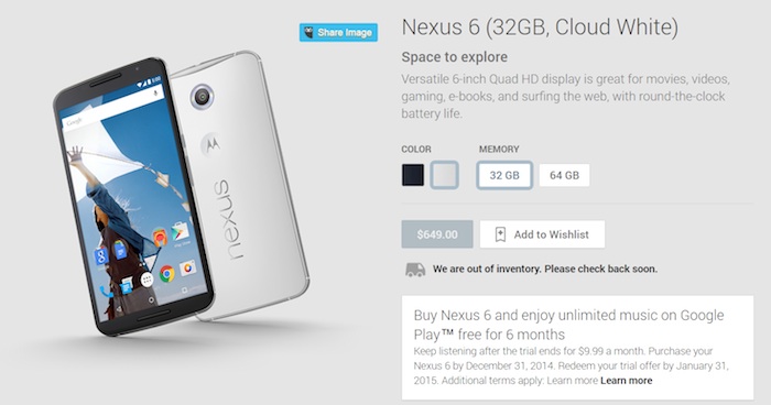 Un Nexus 6 souvent en rupture de stock sur le Google Play Store