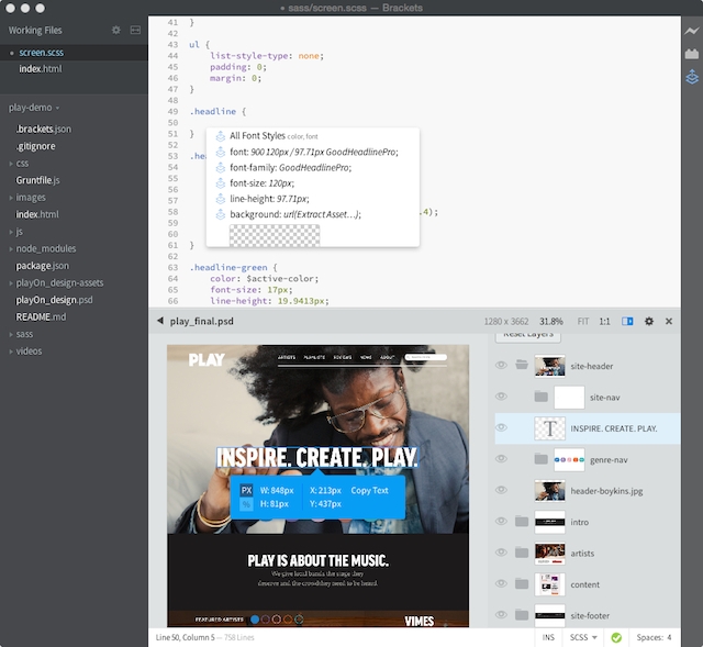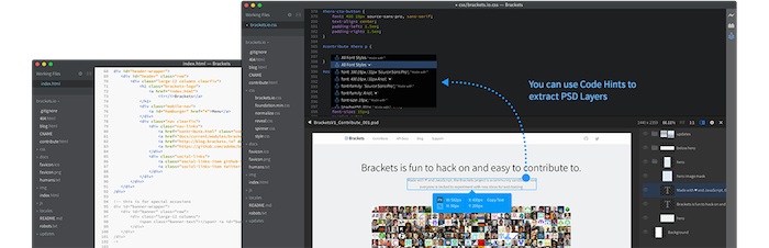 Les récents ajouts comprennent notamment une vue fractionnée, le support des thèmes, et plus encore. La dernière version est également livrée avec une version preview de Extract for Brackets, un projet sous licence MIT, qui est un nouveau service de Creative Cloud qui accélère le processus de transition des informations de conception comme les couleurs, les polices et les gradients d’un fichier Photoshop, afin de le transformer en CSS.