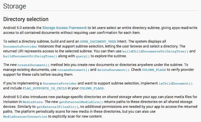 - Les nouvelles méthodes pour accéder aux cartes SD nécessitent Android 5.0, donc ne vous attendez pas à voir des changements majeurs pour les applications fonctionnant sur Android 4.4 ou plus récent