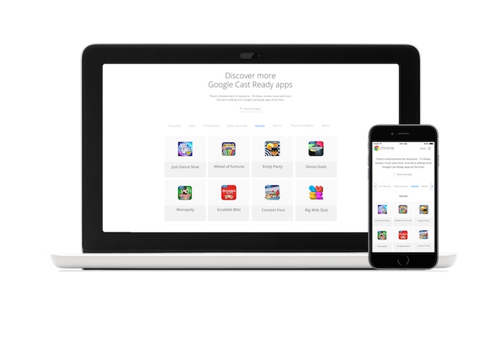 Par exemple, dans Scrabble Blitz vous choisissez les lettres dans un rack virtuel sur votre smartphone, et les scores apparaissent sur le téléviseur. Plusieurs joueurs peuvent se connecter au même Chromecast, et ainsi jouer à tour de rôle. Les autres jeux incluent Monopoly Dash et Simon Swipe ainsi que Just Dance Now, qui utilise votre smartphone pour détecter le mouvement. Big Quizz Web, quant à elle, est une application semblable à Trivial Pursuit qui utilise le Google Knowledge Graph pour les questions et réponses.