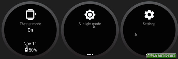 Deux autres mises à jour de Android Wear avec Lollipop comprendront la possibilité d’annuler une carte de notifications rejetée en glissant vers le haut, et deux nouveaux modes de contrôle pour la luminosité. Les modes “Theatre” et “Sunlight” apparaîtront comme des paramètres lorsque vous glissez vers le bas pour afficher un nouveau menu.