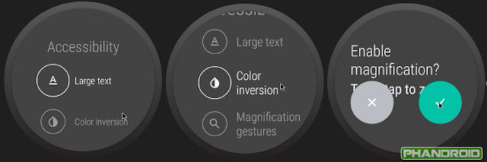 Quelques nouveaux ajouts pour Android Wear via la mise à jour devraient également faciliter la lecture. Il y a de nouveaux paramètres sous “accessibilité” qui incluent l’augmentation de la taille du texte, ou encore le fait d’autoriser l’inversion de la couleur et l’agrandissement des gestes.