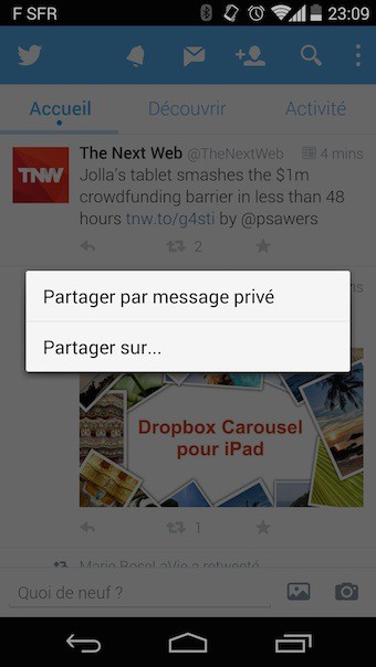 Sur le mobile, la messagerie privée est une tendance croissante où un grand nombre d’applications offre maintenant aux utilisateurs des moyens de communiquer en dehors de la toile ou des réseaux sociaux. Certains vont même plus loin, effaçant des messages ou des photos une fois le message lu. Twitter s’aventure lentement dans ce domaine, étendant les fonctionnalités pour les messages privés – support du partage des liens, support des photos, etc.