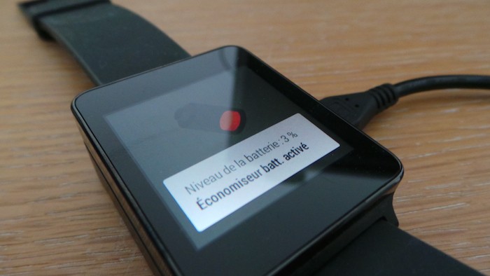 Lorsque vous êtes à court de jus, vous allez tout simplement placer la montre dans un support carré, qui se connecte via USB à une prise. La G Watch se recharge assez rapidement, et le support est très simple d’utilisation.