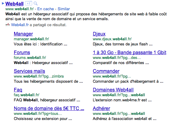 Les “sitelinks” sont des liens spéciaux qui s’affichent sous le premier résultat Google, pour certains sites et certaines requêtes. Google les affiche sans doute pour permettre à l’internaute de se faire une meilleure idée du site avant même de le visiter, et pourquoi pas d’économiser un clic en allant directement sur une des rubriques listées dans ces liens supplémentaires.