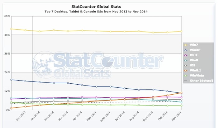 Il a fallu un peu plus longtemps que prévu, mais la nouvelle itération de Windows a finalement devancé le vieillissant Windows XP, et ce plus d’un an après avoir été totalement libérée aux consommateurs. Selon StatCounter, Windows 8.1 vient de passer d’une part de marché de 9,31% au mois d’octobre, à près de 11% en novembre.