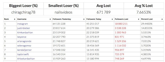 Fait intéressant, cette purge a frappé Justin Bieber, qui avait la place de numéro en terme de célébrité sur le réseau social. Selon le développeur Web Zach Allia, Bieber a perdu près de 15% de ses abonnés (3,5 millions de comptes) après la purge. Après cette “purge”, le total est passé à un peu plus de 20 millions. C’est deux millions de moins que Kim Kardashian, qui a aujourd’hui environ 22 millions de followers, et ce après avoir perdu environ un peu plus de 5% de son taux d’abonnés. Le compte Instagram le plus suivi, évidemment Instagram, a perdu près de 19 millions d’abonnés, passant le nombre total à 45 millions.