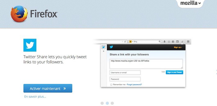 Firefox Share est également pleinement fonctionnel, vous permettant de facilement partager du contenu Web sur vos réseaux ou services sociaux préférés tels que Facebook, Twitter, Gmail, Google+ ou LinkedIn, pour n’en nommer que quelques-uns. Vous devez cliquer sur l’icône représentant un avion en papier dans la barre d’outils pour activer le partage. Évidemment, il faudra autoriser les services souhaités.