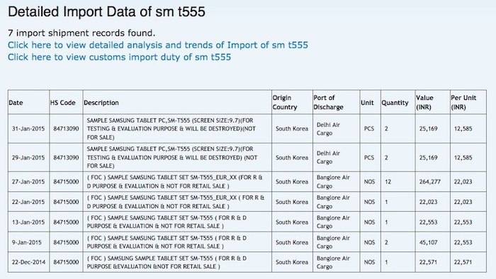 Le célèbre site indien d’importation Zauba vient d’afficher ce qui semble être de nouveaux échantillons de tablettes, décrites sous forme de tablettes Samsung SM-T555 avec un écran de 9,7 pouces. Outre les informations sur le site d’import, les gens de chez SamMobile ont récemment rapporté qu’une tablette, ou une famille de tablettes de la nouvelle gamme Galaxy Tab 5 avec ce même numéro de modèle et taille d’écran pourraient être sur le point de voir le jour.