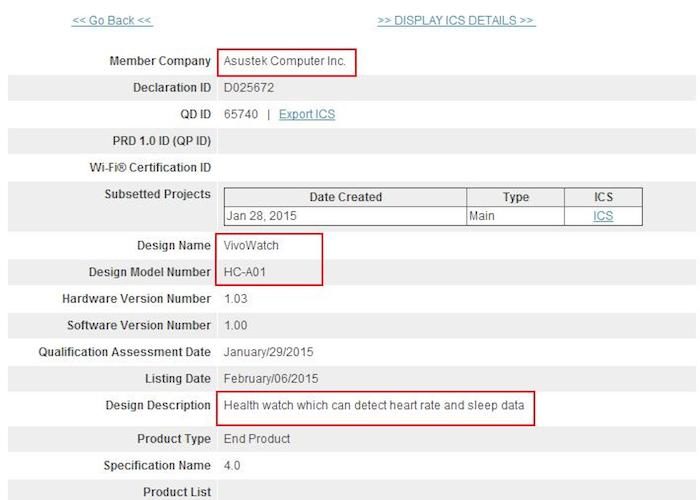 En effet, une nouvelle entrée d’ASUS est apparue dans la base de données du Bluetooth SIG. Comme c’est habituellement le cas, il n’y a pas beaucoup de détails sur le dispositif – seulement qu’il s’appelle VivoWatch, qu’il est fabriqué par ASUS, et qu’il offre un support à la technologie Bluetooth 4.0. Il y a évidemment plus de détails techniques au sujet du Bluetooth, ce qu’il peut gérer, mais pas d’informations supplémentaires sur le matériel.