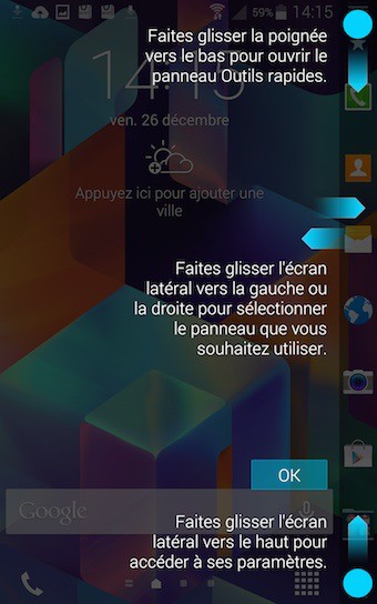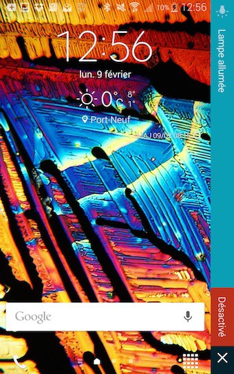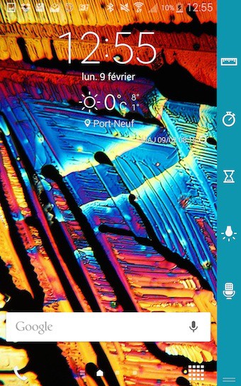 Vous pouvez également rapidement accéder à des outils clés comme la lampe de poche, l’enregistreur, et la minuterie en tirant vers le bas le panneau bleu à partir depuis le haut du panneau. La nuit, le bord va servir d’horloge (très discrète), de sorte que vous n’avez pas à vérifier l’heure quand vous vous réveillez à 4 heures et que vous êtes convaincu qu’il est 6h30 et l’heure de se lever.