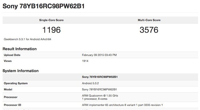 Selon le benchmark repéré sur Geekbench, le futur smartphone de Sony va disposer d’un processeur Qualcomm MSM8994 (aka l’octo-core Snapdragon 810). Alors que nous ne pouvons pas être certains qu’il s’agit du Xperia Z4, il s’agit d’un processeur haut de gamme, que l’on peut attendre dans le prochain smartphone phare de Sony. Autrement dit, il semble très probable que ce soit bien lui.