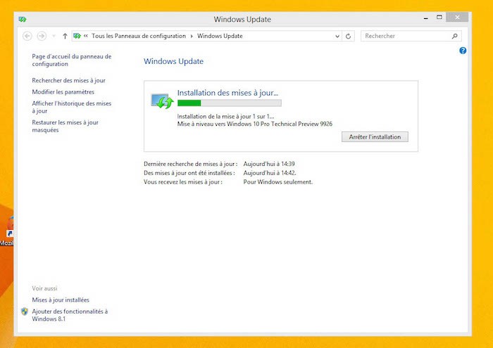 Bien que vous ayez la possibilité de télécharger la build 9926 de Windows 10 Technical Preview via Windows Update, elle ne sera pas affichée par défaut. Tout d’abord, vous devez installer une petite mise à jour que vous pouvez télécharger depuis la page Technical Preview. Il suffit de vous rendre sur cette page, et de cliquer sur le bouton “Mettre à jour maintenant”. Prenez soin de bien lire les avertissements sur cette page.
