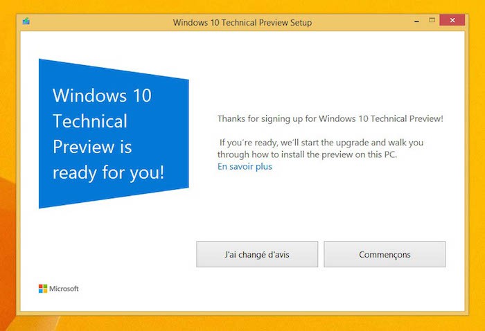 C’est une option beaucoup plus simple que de télécharger l’image ISO, et c’est une mise à niveau qui encourage les gens à installer la version Technical Preview de la prochaine itération du système d’exploitation de bureau de Microsoft sur leur ordinateur de tous les jours. Mais, n’oubliez pas que ce n’est pas un produit fini, et qu’il n’est pas conseillé de l’utiliser sur un bureau de tous les jours ! Si nous avons déjà vu comment installer de Windows 10 dans une machine virtuelle, si vous avez une machine de secours fonctionnant sous Windows 7 ou 8 en l’utilisant comme un banc d’essai pour Windows 10, sachez que c’est désormais une chose aisée.