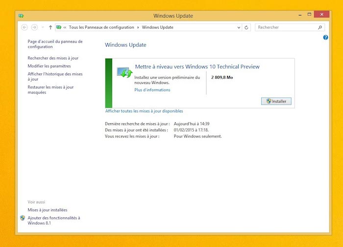 Si vous êtes sûr de ce que vous faites et que vous êtes prêt à tester Windows 10, il suffit de lancer l’exécutable que vous avez précédemment téléchargé. Vous pouvez constater que Windows Update se lance dès que cette installation est terminée. Si tel n’est pas le cas, vous devez redémarrer Windows et lancer Windows Update manuellement.