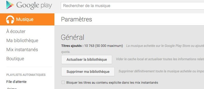 Vous pouvez télécharger votre bibliothèque musicale sur Google Play en utilisant l’application Google Music Manager ou grâce à l’application installable depuis le Chrome Web Store. Une fois que votre musique est en ligne, vous pouvez utiliser l’application Play Music sur votre dispositif mobile ou ouvrir n’importe quel navigateur Web pris en charge et visiter play.google.com/music pour commencer à diffuser vos pistes (ou gérer votre bibliothèque de musique ou télécharger de la musique). Vous pouvez également créer des mix instantanés dès lors que vous voulez créer une playlist des chansons de votre bibliothèque.