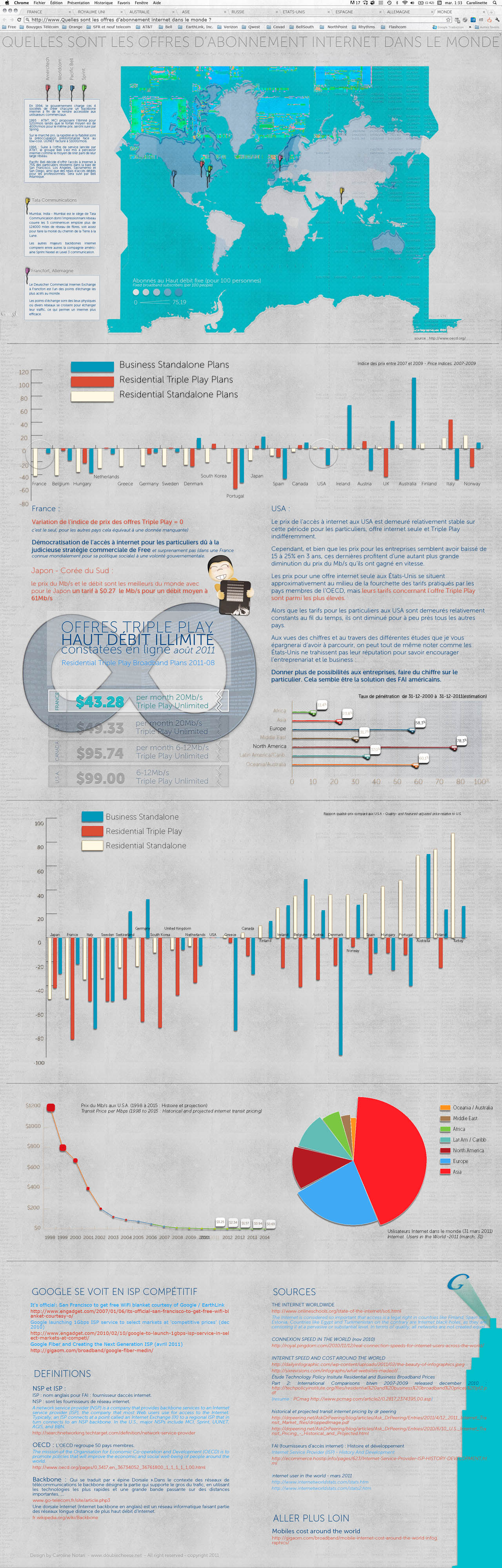 Sur cette hypothèse de départ, j’ai décidé d’enquêter sur l’évolution du tarif internet pratiqué dans le monde (en fait, aux USA, ceux qui l’ont inventé, en France et Grande-Bretagne notamment pour comparer) depuis qu’internet est grand public ; et finir par répondre à ma question : “est-ce que vraiment internet ne serait illimité qu’en France ?”