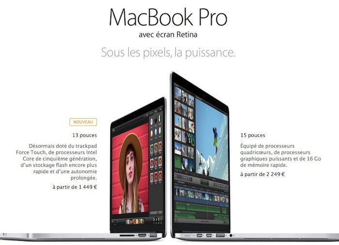 En effet, le MacBook Pro de 13 pouces a été mis à jour avec les derniers processeurs mobiles, et processeurs graphiques, tout en disposant d’un stockage flash plus rapide, et une autonomie qui offre un gain supérieur aux anciens modèles. De plus, il dispose du tout nouveau trackpad, offrant des capteurs capables de détecter les différences de pression que vous exercez. La gamme de MacBook Air dispose quant à elle des derniers processeurs mobiles et graphiques, un port Thunderbolt 2 plus rapide, ainsi qu’un stockage flash ultra-rapide sur le modèle de 13 pouces..