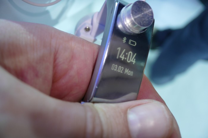 Il y a un unique bouton physique sur la droite qui va permettre d’allumer ou verrouiller le dispositif. Le reste de l’utilisation est assurée par l’écran tactile PMOLED de 0.7 pouce. Il n’y a pas beaucoup de choses qui s’inscrivent sur l’écran d’accueil, hormis l’heure, la date et le pourcentage restant de batterie.