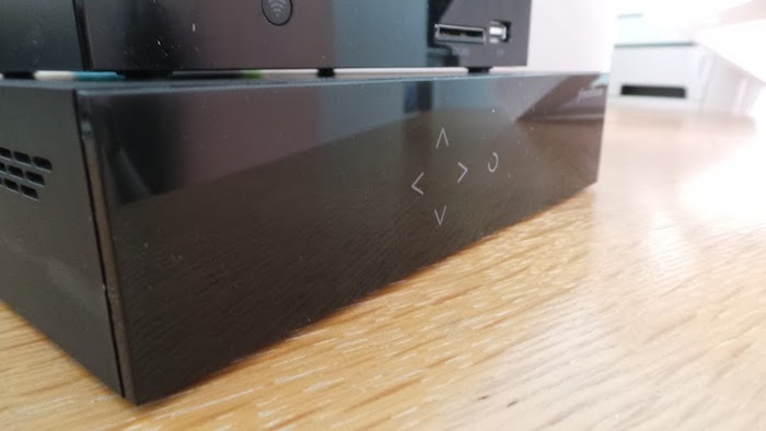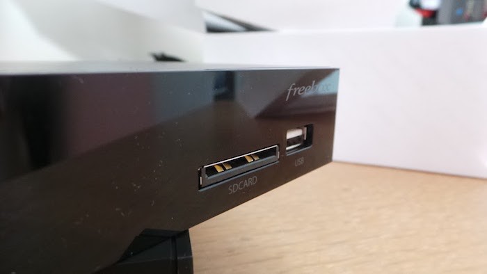 Pour son design, en façade on retrouve une façade brillante, toujours noire, un simple logo freebox sur la droite, et un port USB 2.0 et un lecteur de cartes SD en dessous. On retrouve également un bouton permettant de faciliter la synchronisation avec la télécommande sans fil, et un témoin lumineux orange.