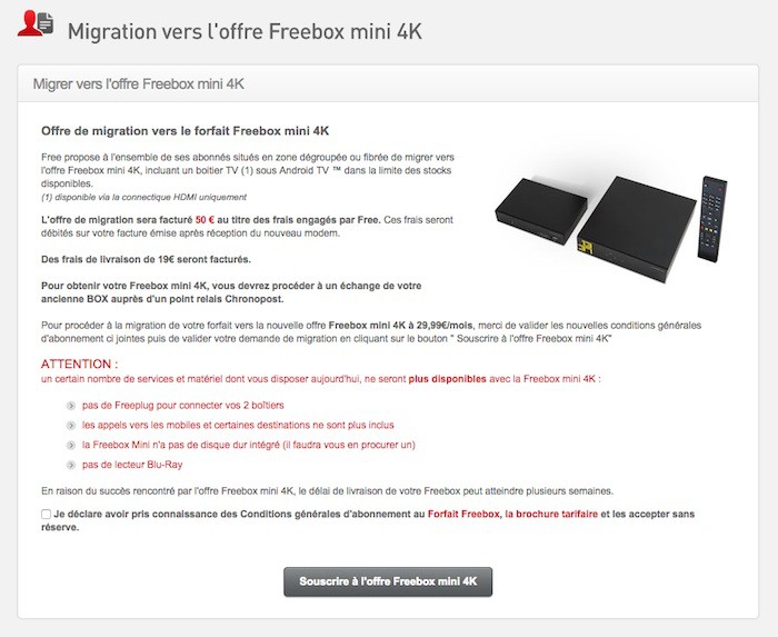 Annonçant une disponibilité rapide, et presque après sa conférence de presse, j’ai été déçu de ne pas voir activée sur mon portail Free la possibilité de migrer vers cette Mini 4k. En effet, ce n’est que le 13 mars que Free a ouvert les vannes, libérant ainsi la procédure d’échange de ma Freebox v5 par une Freebox Mini 4K.