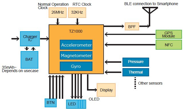 Un autre module offre des fonctionnalités de suivi d’activité, par un processeur de faible puissance ARM Cortex-M4F, et divers capteurs tels qu’un accéléromètre, un gyroscope et un magnétomètre.