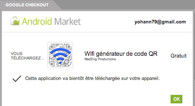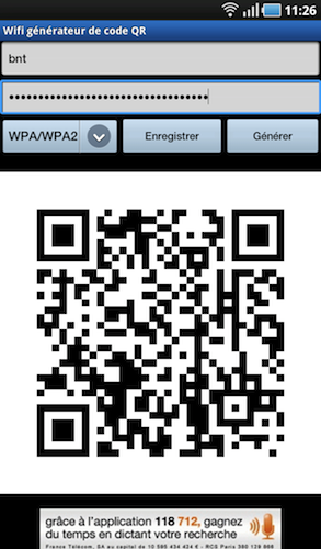 C’est ainsi que {niKo[piK]} a trouvé une application sur l’Android Market pour réaliser un QR Code qui va répondre à votre besoin, c’est-à-dire fournir vos identifiants Wifi dans un QR Code. Il s’agit de Wifi QR Code Generator.