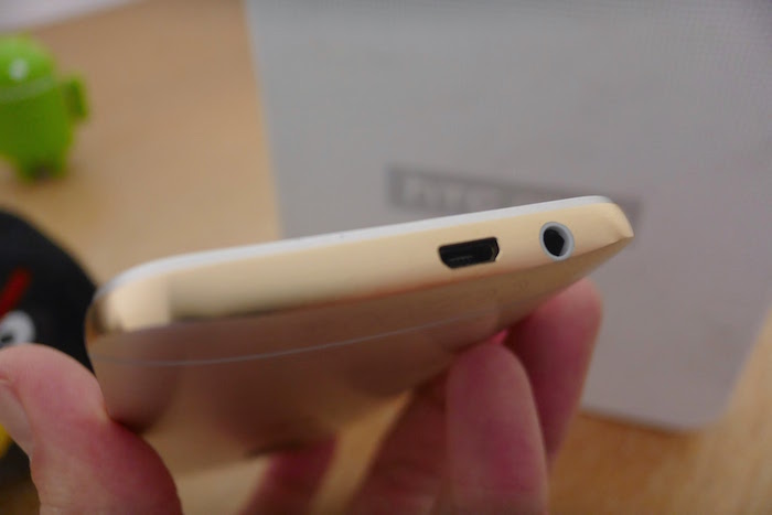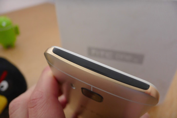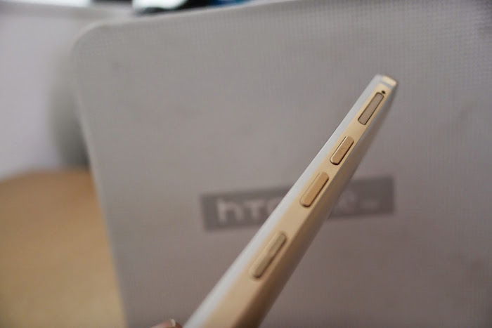Une fois que je m’y suis habitué, le rebord n’a pas été trop ennuyeux. Il semble tout aussi attrayant avec les deux tons, argenté et or. HTC a utilisé un double processus d’anodisation pour obtenir les deux teintes métalliques : l’or sur les bords et l’argent à l’arrière. Le rebord est également en argent, tout comme les grilles de haut-parleur en haut et en bas du smartphone. Le look en deux tons est très élégant et ajoute beaucoup de style, sans dénaturer l’appareil.