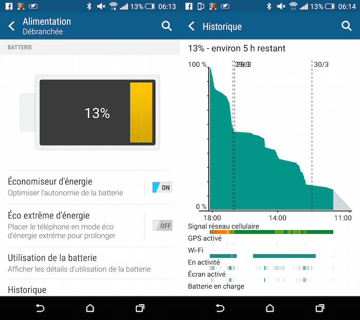 Le HTC One M9 a une batterie de 2 840 mAh, qui est aussi petite que celle de l’iPhone 5S. Après un trajet de métro de 30 minutes, au cours duquel l’écran est éteint, et que j’écoute simplement un podcast, je suis arrivé à ma réunion avec une batterie passant de 100% à 80%. Autour de 16h30, après vérification des e-mails, l’envoi de SMS, et d’autres applications professionnelles, la batterie est tombée à 36%. Autrement dit, oubliez de suite ce smartphone si vous ne voulez pas le recharger tous les jours.