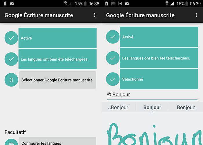 Une fois que vous avez installé l’application sur un dispositif mobile sous Android 4.0 ou plus, il vous suffira de suivre les instructions pour installer la saisie manuscrite en tant que clavier par défaut sur celui-ci. Vous pouvez toujours faire apparaître un clavier normal en appuyant sur l’icône de globe pour basculer dans le traditionnel mode clavier.
