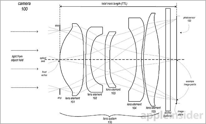Le brevet décrit en détail comment la double caméra serait capable d’interchanger les iris, ou stopper l’ouverture du diaphragme, permettant à l’utilisateur de modifier le rapport focal de 2.4 à 10.0. Cela offrirait un vaste éventail de personnalisation pour chaque cliché, ce qui n’est actuellement pas possible sur la caméra iSight de l’iPhone 6.