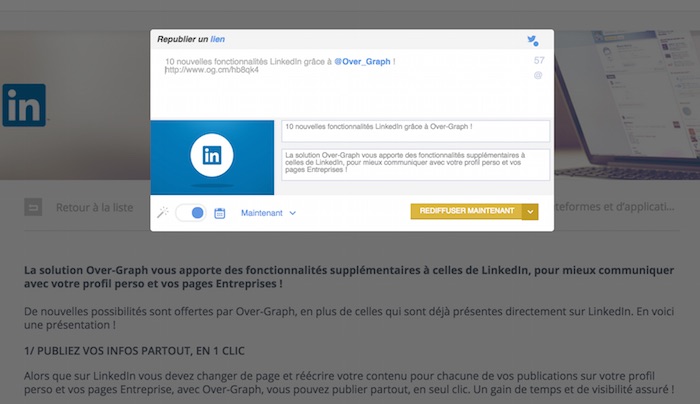 Vous l’aurez compris, Over-Graph vous permet de vous connecter à vos profils et pages Facebook et LinkedIn, vos comptes Twitter et Instagram, ainsi que vos chaînes Youtube via une même interface. Une aubaine lorsque l’on sait que pour une marque il est inenvisageable de ne pas s’afficher sur les réseaux sociaux ! Avec un tel outil, il devient plus facile de manager vos publications.