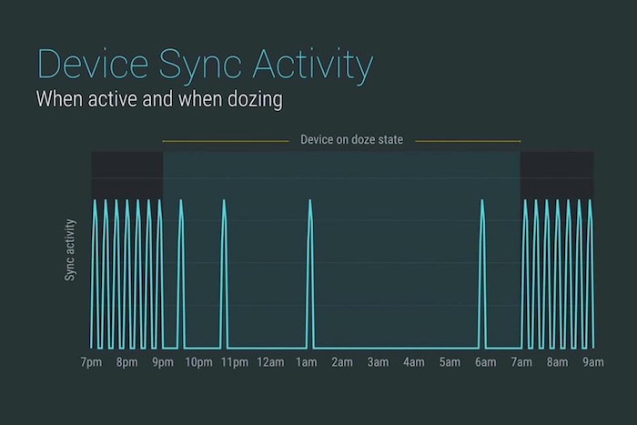 Pour déterminer au mieux cet état, Android va analyser quand l’écran était actif pour la dernière fois. Il va également utiliser la détection de mouvement afin de déterminer quand un appareil est inactif. Durant les longues périodes d’inactivité, Doze va réduire tous les services qui consomment de l’énergie, et influent sur l’autonomie du dispositif. Google précise que cette nouveauté va diminuer la consommation d’énergie en veille jusqu’à deux fois.