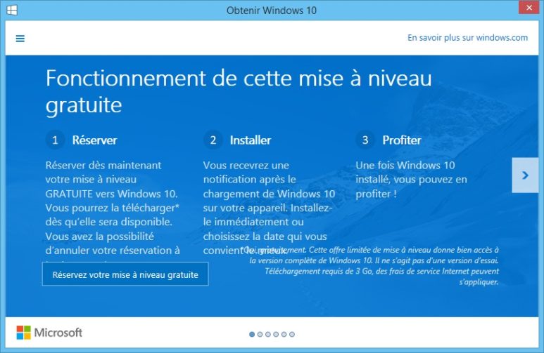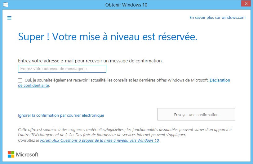 En cliquant sur le bouton, une fenêtre pop-up s’ouvre expliquant comment le processus fonctionne. Donnez à Microsoft votre adresse e-mail ou non, et puis Windows 10 va automatiquement télécharger l’OS sur votre ordinateur une fois que Microsoft poussera la mise à jour.