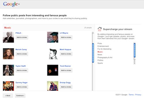 Conscient du premier mur auquel sont confrontés les nouveaux inscrits sur le réseau social, Google Plus propose des suggestions de célébrités à suivre.