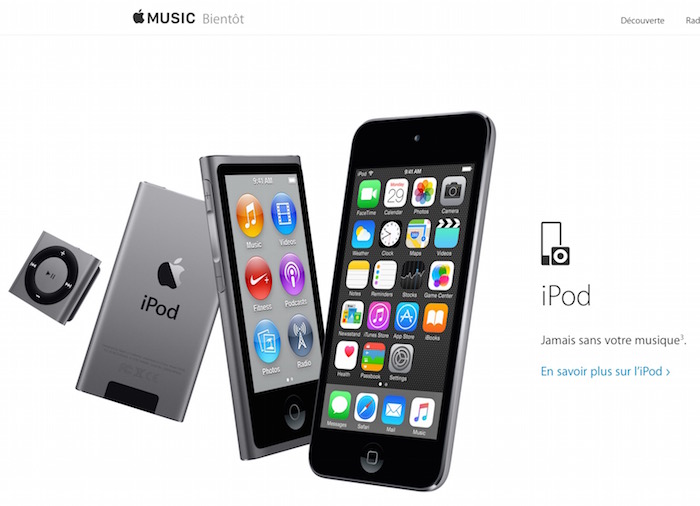 Néanmoins, et même si le raccourci sur la navigation du site a disparu, la page pour l’iPod est toujours disponible sur le site. Mais, elle est à l’écart afin de faire place au nouveau service de musique streaming, que Apple a présenté ce lundi. D’ailleurs, c’est sur cette page que l’on retrouve un encart pour l’iPod.