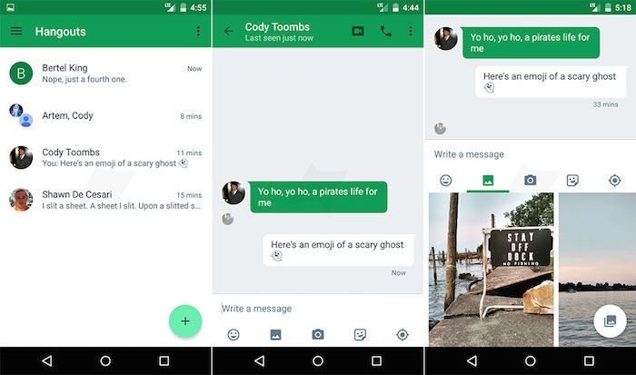 L’écran de conversation va également recevoir quelques changements. Dans un écran de chat, Hangouts ressemble beaucoup plus à iMessage avec ses bulles flottantes et arrondies. Une nouvelle barre de menu en bas du champ de saisie du message remplace l’icône du trombone, et permet d’ajouter rapidement des photos, des emojis ou une localisation à vos messages.