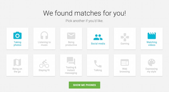 Le nouveau site de Google vous aide à trouver l’appareil idéal en vous posant une série de questions sur ce que vous utilisez sur votre smartphone. Par exemple, vous pouvez choisir “Prendre des photos” ou “jouer” – ou si vous voulez vraiment vous la faire à l’ancienne, vous pouvez choisir “communiquer”.