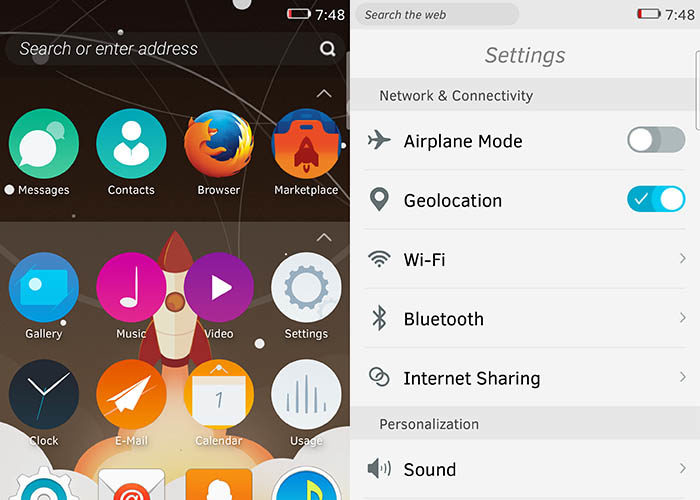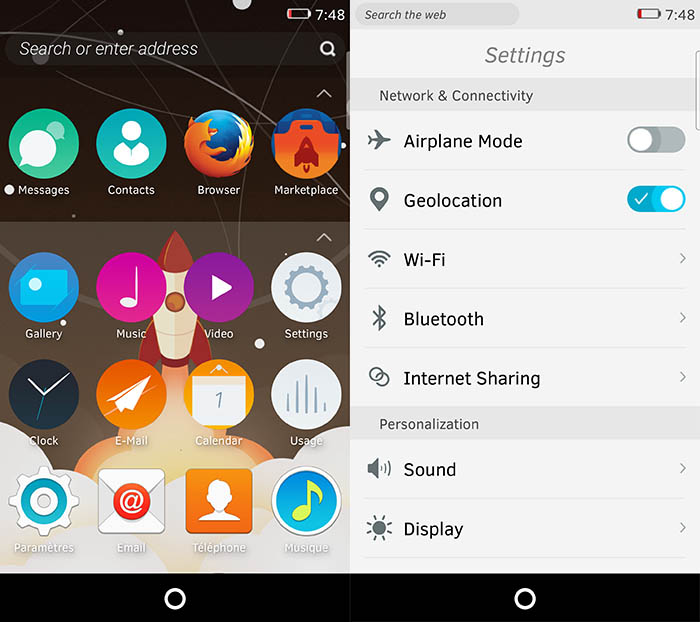 Près du haut de l’écran, vous trouverez également des raccourcis vers des fonctionnalités importantes, telles que l’accès à l’application Messages, Contacts, Navigateur, et le Marketplace (qui est la boutique d’applications de Mozilla pour les applications tierces développées en utilisant le langage HTML5 et d’autres technologies Web).