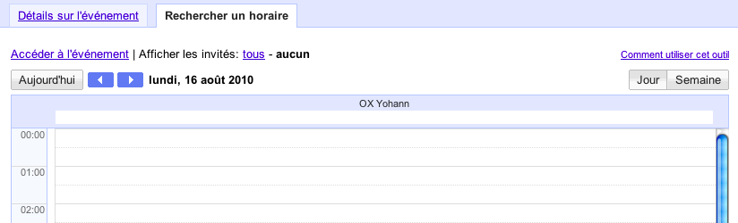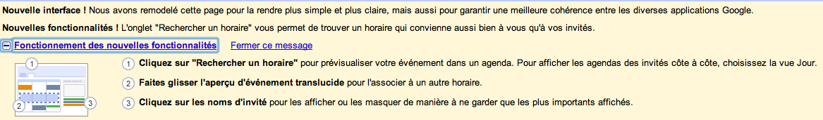 Un autre ajout, est l’affichage d’un volet intitulé “Rechercher un horaire” sur la page de l’évènement. Il permet de choisir le “bon” moment pour prendre un rendez-vous. Lorsque vos amis ou vos collègues vous donnent la permission de voir leurs agendas, vous pouvez cliquer sur cet onglet pour afficher un aperçu de leurs agendas et afficher le détail d’un évènement pour avoir une vue sur les éventuels conflits. Cela devrait permettre de rendre la planification d’une tâche commune plus facile, surtout pour un évènement avec un grand nombre d’invités.